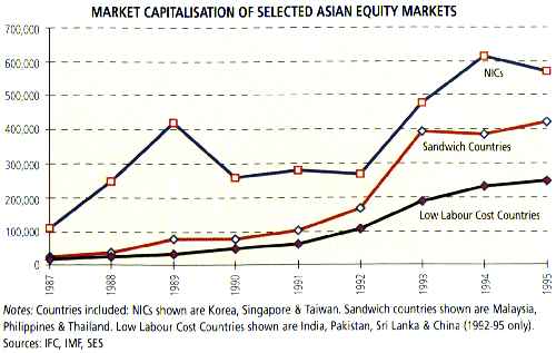 World Bank figures show that although "portfolio flows [into developing countries], especially equity flows, declined during 1994 and 1995, reflecting their greater susceptibility to short-term shocks and changes in market conditions ... portfolio bond and equity flows have both recovered strongly in 1996, contributing to a further increase in private capital flows this year." The temporary decline can be seen in the levelling off of the graph, showing market capitalisations of selected Asian markets (aggregated into categories suggested by Dr Mark Mobius of Templeton - see below).